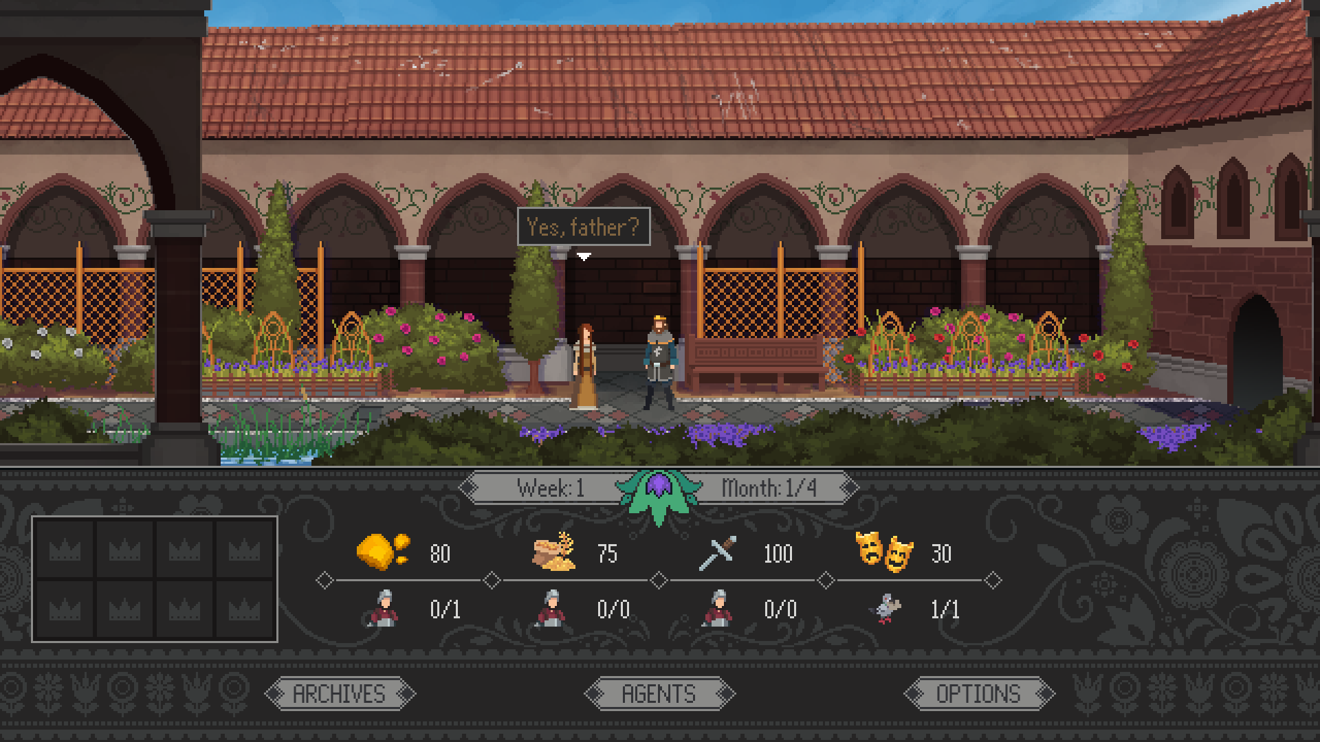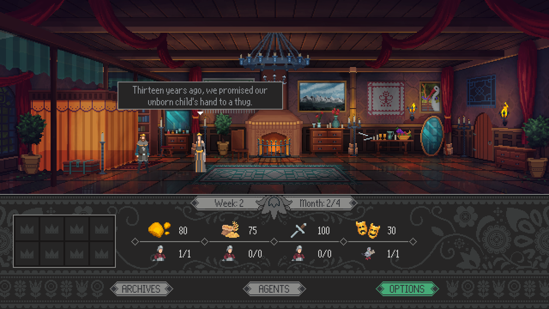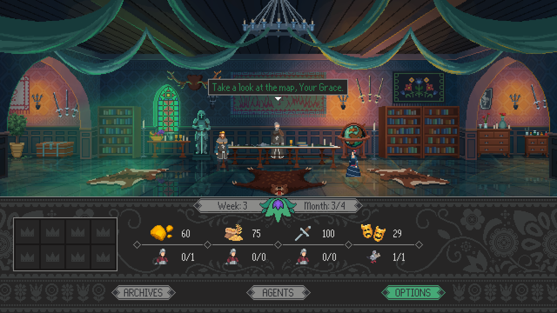Yes, Your Grace is a kingdom management RPG, where petitioners will arrive in your throne room each turn to ask for your advice and assistance. Decide whether to help them with their problems, or to conserve resources for more important matters. Remember: supplies are limited, and not everyone has the kingdom’s best interests at heart...